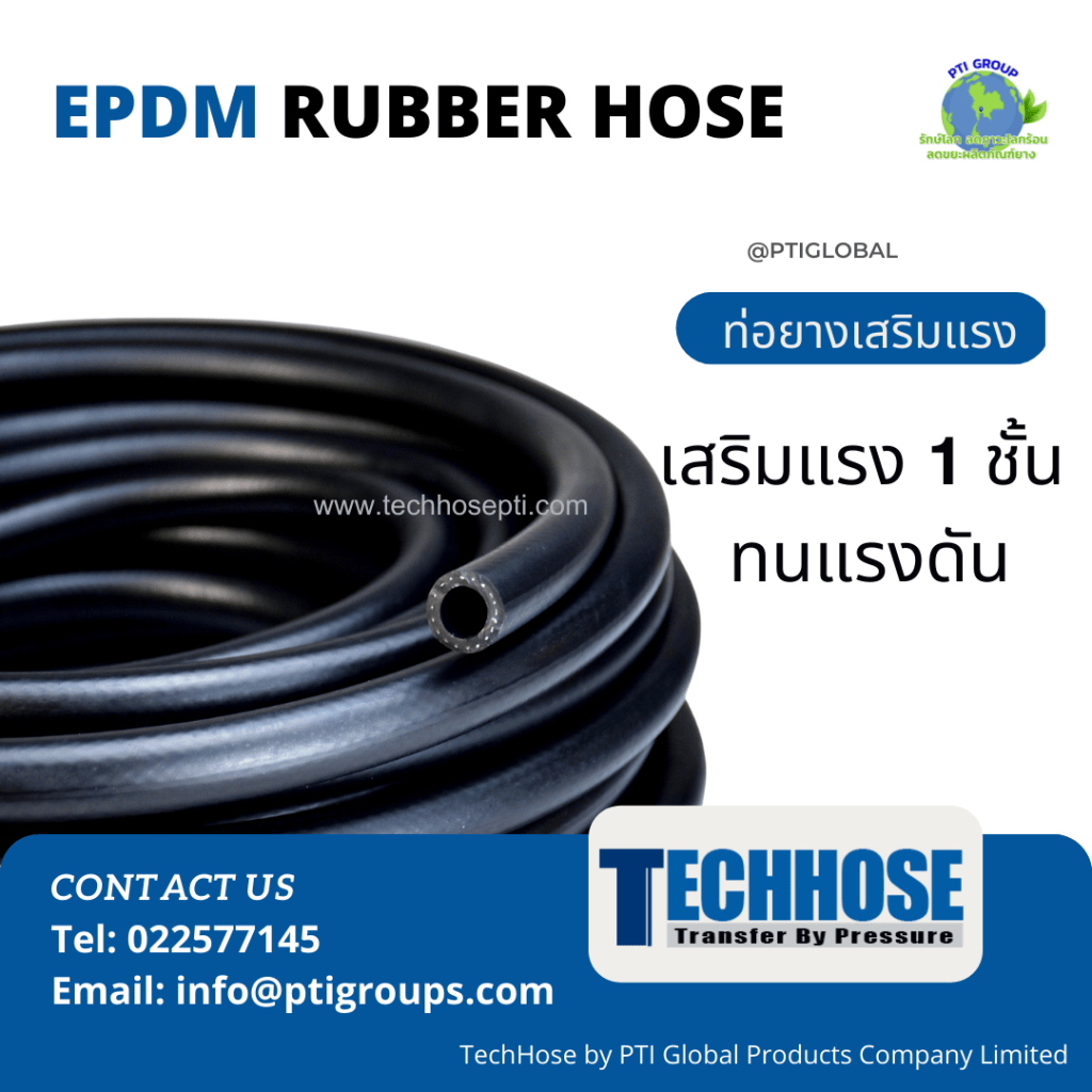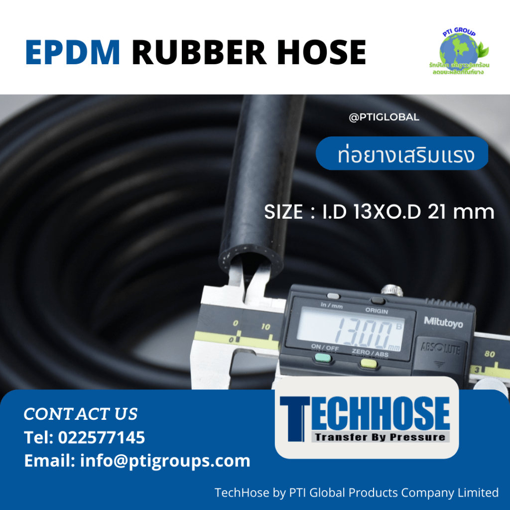 ใหม่! ท่อยางEPDM เสริมแรง 1 ชั้น Size I.D 13 X O.D 21 mm วัตถุดิบ 100% EPDM เสริมแรง 1 ชั้น ทนแรงดัน เหมาะสำหรับการใช้งาน ส่งผ่านของน้ำ น้ำร้อน และสารเคมี รองรับอุณหภูมิการใช้งาน -40 to +120oC TechHose